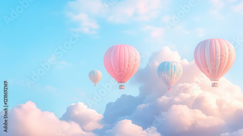 Naklejka premium Pastel hot air balloons drifting in serene sky above fluffy clouds on a...
