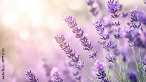 Naklejka premium Pastel lavender and pink flowers bloom in a serene garden during the golden...