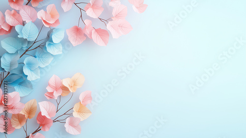 Naklejka premium Pastel leaves in soft colors create serene and calming atmosphere against light blue background. This abstract design evokes feelings of tranquility and nature beauty