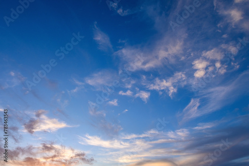 Obraz premium Pastel light cirrus clouds in the blue sky during dawn sunset sunrise, sky...