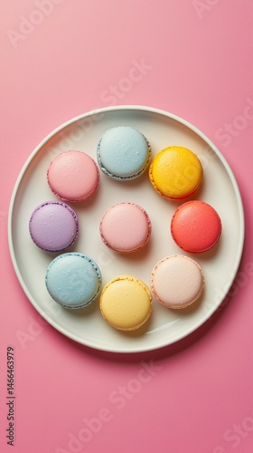 Obraz premium Pastel macarons arranged on white plate against bright pink background