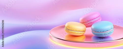 © Phatharaporn, Obraz premium Pastel Macarons on Pink Reflective Surface