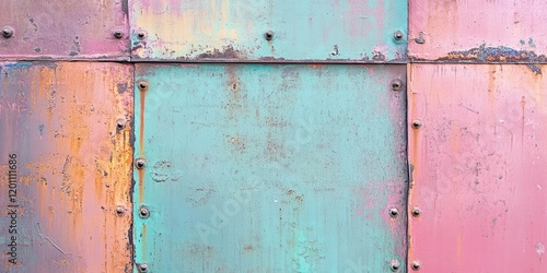 © Rufat, Naklejka premium Pastel metal plate background with soft pink, teal, and orange hues, featuring a textured surface and rust for vintage aesthetic appeal