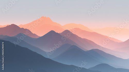 Fototapeta premium Pastel mountain landscape with soft sunrise gradient and layered silhouettes