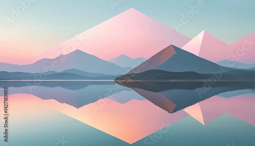 Naklejka premium Pastel mountains and pyramids reflected in calm water creating a serene and...