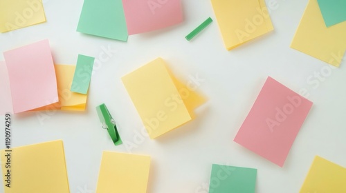 © megatron, Fototapeta premium Pastel notes scattered on white desk, planning