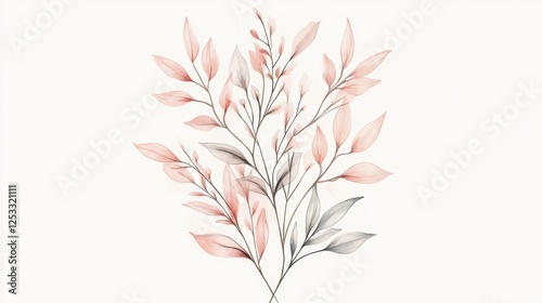 Fototapeta premium Pastel pink and gray leaves bouquet, white background, botanical illustration, wedding invitation