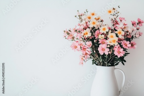 © kucret, Fototapeta premium Pastel pink and yellow flowers in a white vase against a white wall.