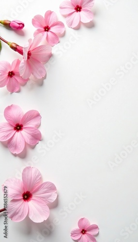 © Sarayuth, Fototapeta premium Pastel pink blooms scattered on a clean white surface, minimalism, clean