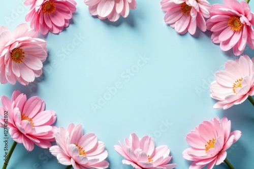 Fototapeta premium Pastel Pink Blossoms Arranged in a Delicate Oval Frame on a Light Blue...