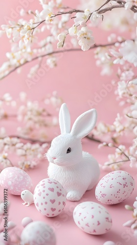 Obraz premium Pastel Pink Easter Bunny with Blossoms and Eggs
