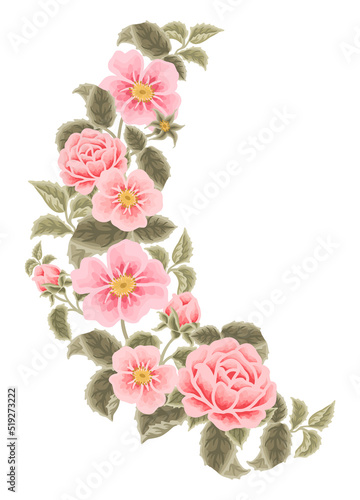 Fototapeta premium Pastel pink floral bouquet illustration with roses, peony, green leaf...