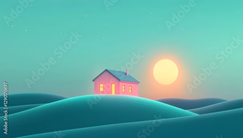 © afterfast, Naklejka premium Pastel pink house on hills at sunset