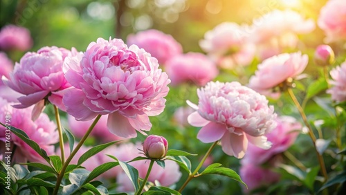Obraz premium Pastel pink peonies blooming in a lush garden