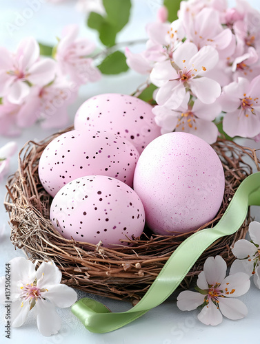 Fototapeta premium Pastel pink speckled Easter eggs in a bird's nest, adorned with delicate spring blossoms and ribbon . AI generative