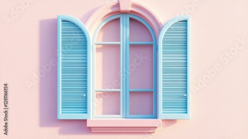 Fototapeta premium Pastel pink wall with arched window and light blue shutters.