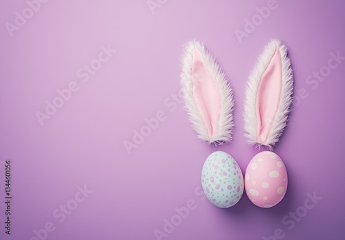 © Paul, Fototapeta premium Pastel Purple Background with Easter Bunny Ears and Eggs in Flat Lay Top View Composition