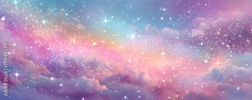 Fototapeta premium Pastel rainbow sky background with stars and clouds, a dreamy soft celestial backdrop