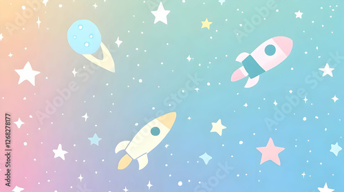 Naklejka premium Pastel rockets fly across starry sky; cosmic background for kids