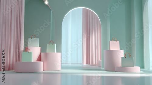 Obraz premium Pastel Shopping Bags on Display Podiums with Arched Background in a...