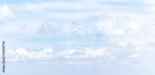 © Antibydni, Naklejka premium Pastel soft banner with summer blue sky and white clouds. Natural background. Heaven, paradise and hope metaphor.