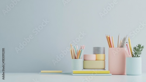 © STwul, Obraz premium Pastel stationery and supplies on a desk against a light blue wall.