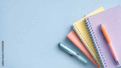 © naim, Fototapeta premium Pastel Stationery Set with Spiral Notebooks, Pen, and Paper on Light Blue Background with Copy Space