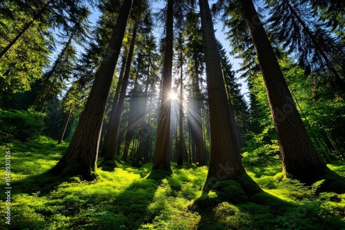 © Sanchai, Fototapeta premium Pastel sunbeams filtering through a forest canopy, with soft hues creating a magical patchwork of light on the forest floor