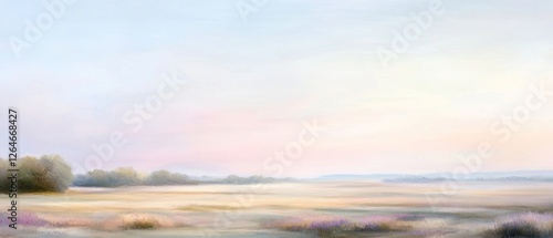 © artzone, Obraz premium Pastel Sunset Landscape: Serene Field with Soft Light and Distant Trees