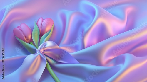 © akhmad, Fototapeta premium Pastel tulips, silk fabric, bow, iridescent background, greeting card