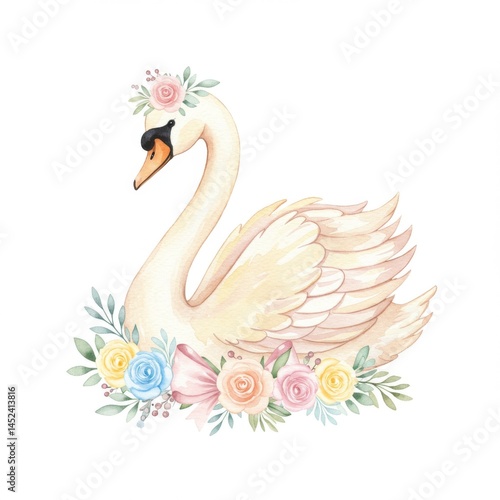 Obraz premium Pastel Watercolor Swan with Floral Wreath