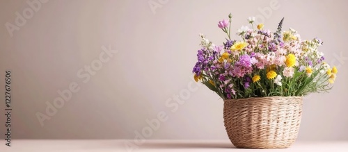 © Seyyar, Fototapeta premium Pastel wildflower centerpiece in straw basket with empty copyspace for text showcasing spring floral arrangement and creativity