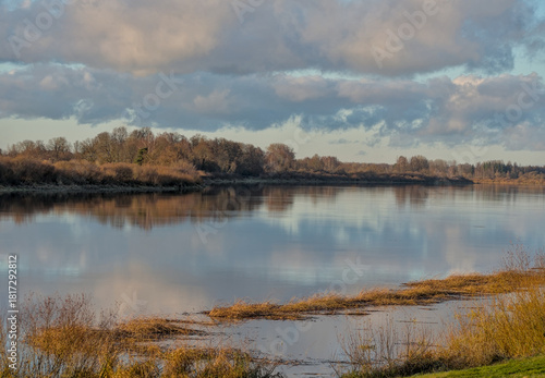 © light, Fototapeta premium Pastel winter sunset river landscape - Fluffy clouds over wide autumn river