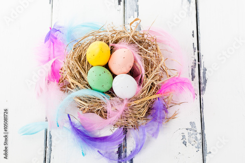 Obraz premium pastellfärgade ägg i fågelbo mot vintage bakgrund och fjädrar