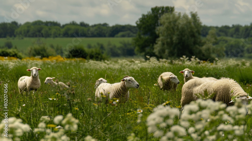 © Sascha, Fototapeta premium Pastoral Harmony: Grazing Sheep in Idyllic Fields. Generative AI