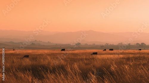 © Alona, Obraz premium Pastoral scene of grazing cattle with a glowing sunset sky