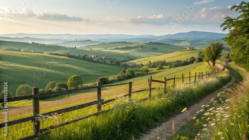 Naklejka premium Pastoral scenery of rolling hills and meadows in a vibrant green, under a sky filled with fluffy clouds, with a country fence.