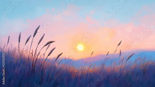 © Chaikit, Fototapeta premium pastoral sunset scene, amber wheat stalks, pink and blue sky gradient, gentle rolling hills, rising golden sun, peaceful rural landscape, wispy cloud details, soft evening atmosphere