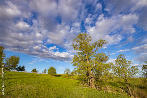 Obraz premium Pasture with green grass against a blue sky. Landscape with a tree against a cloudy sky.