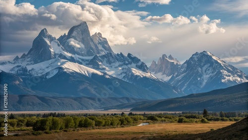 Fototapeta premium Patagonian Landscape Wide Shot of Snowy Peaks, Valley, Clouds, Patagonia,...