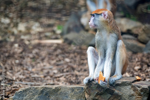 Obraz premium Patas Monkey or Erythrocebus patas eats bread in captivity