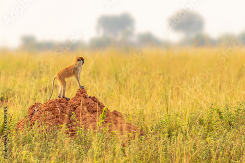 © Gunter, Naklejka premium Patas monkey or hussar monkey looking for danger in beautiful morning light, Murchison Falls National Park, Uganda.