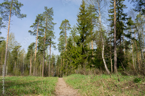 Obraz premium patch in a mixed birch, pine and fir tree forest in morning time
