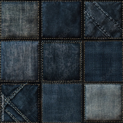 © Thanawin, Naklejka premium Patchwork denim texture with stitched fabric squares, perfect for background designs.