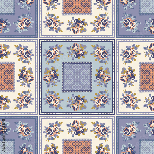 Obraz premium Patchwork pattern with rose floral ornaments. Stylized rose flowers, lines,...