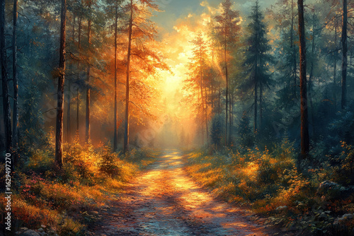 © Barno, Fototapeta premium Path cutting through a forest in a painting.