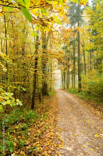 Fototapeta premium Path in a beautiful autumn forest surrounded by lush trees. Southern Germany