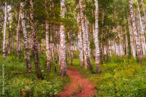 © Lana Kray, Obraz premium Path in a beautiful birch grove in the mountains, on sunny summer day