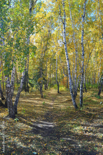 © Светлана Ильева, Naklejka premium Path in a birch grove. Autumn landscape.