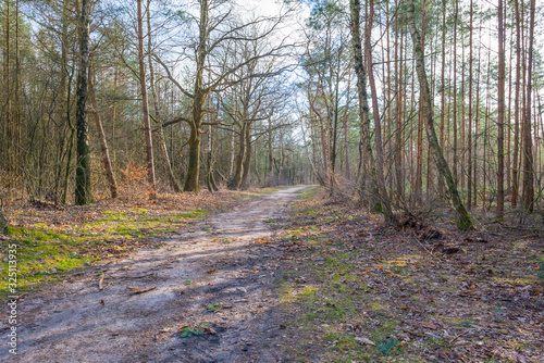 Fototapeta premium Path in a forest with pines and deciduous trees in sunlight in winter